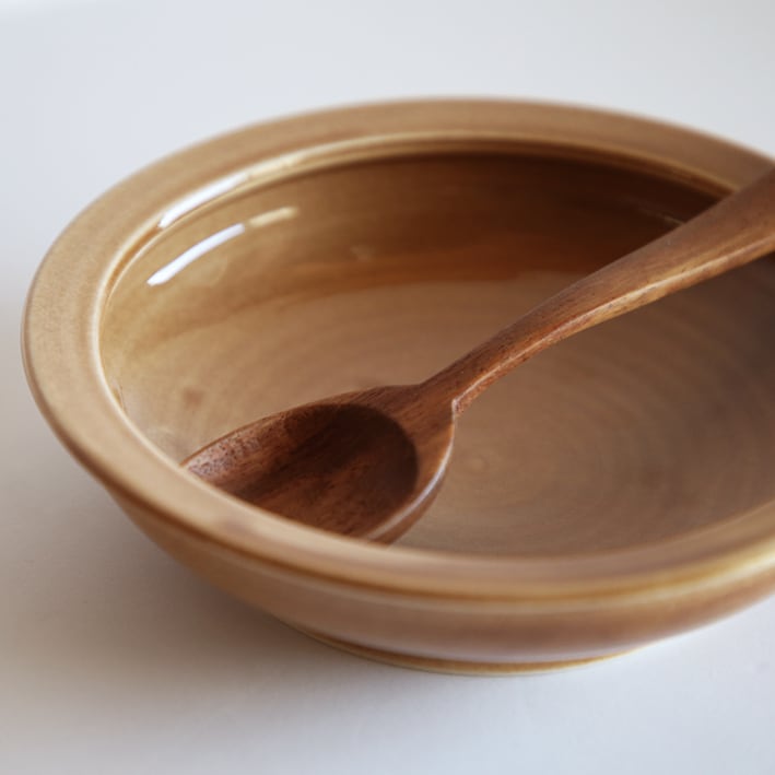返しが無かったり外へ立ち上がる形の場合、大抵は器を傾けてすくう事になりますが、この器ですと最後まで左手は器に手を添えているだけ。