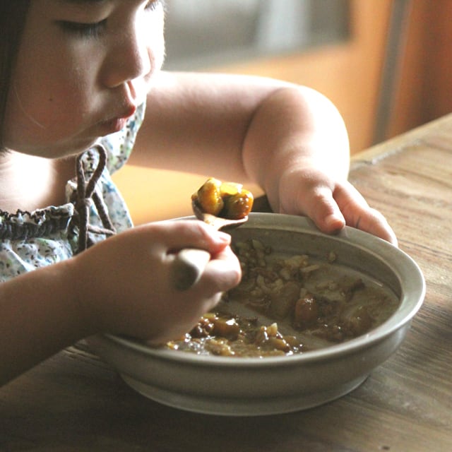 そのため、沢山の量があるうちからカレーを外へ向けてすくおうとすれば、立ち上がりで抑えきれず外へ溢れてしまいますし、どんなすくい方をしてもこぼれない訳ではありませんが、子供が1人でこぼさず食べる為の第一歩の器になればと思っています。